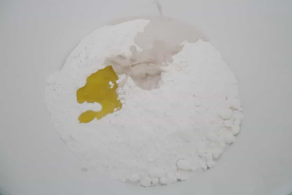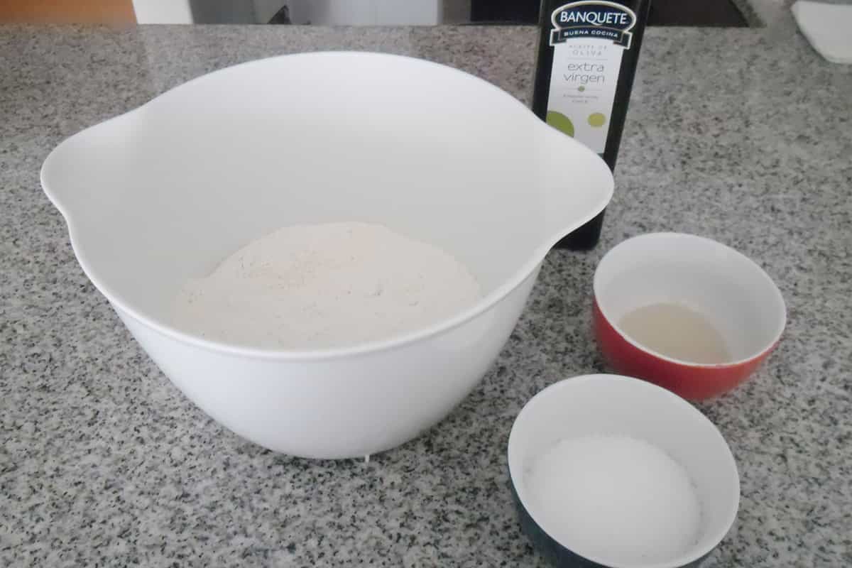 Aparte, en un bowl grande, agrega las dos tazas de harina, la sal (a gusto) y el aceite. Finalmente añade la levadura.