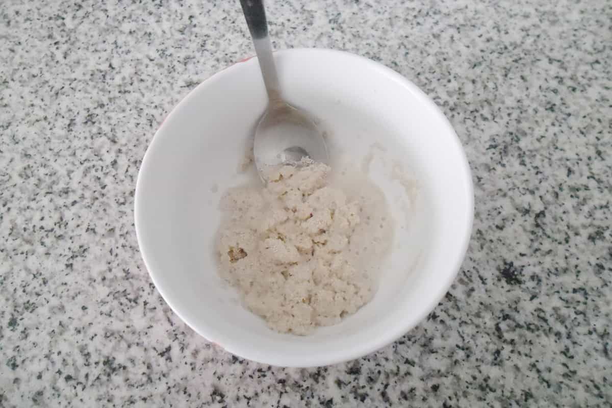 En un recipiente pequeño, mezcla la levadura con dos cucharadas de agua tibia (no hirviendo), hasta formar una pasta homogénea.