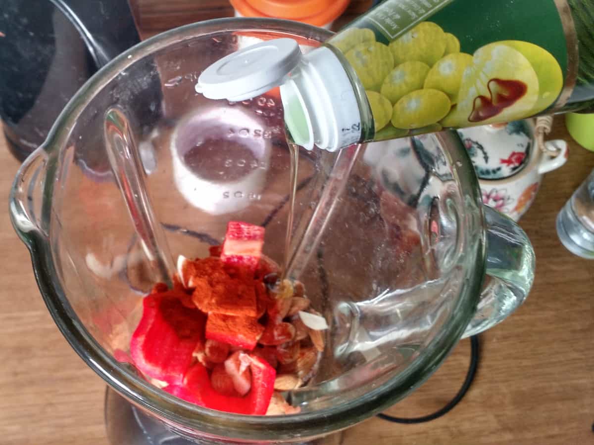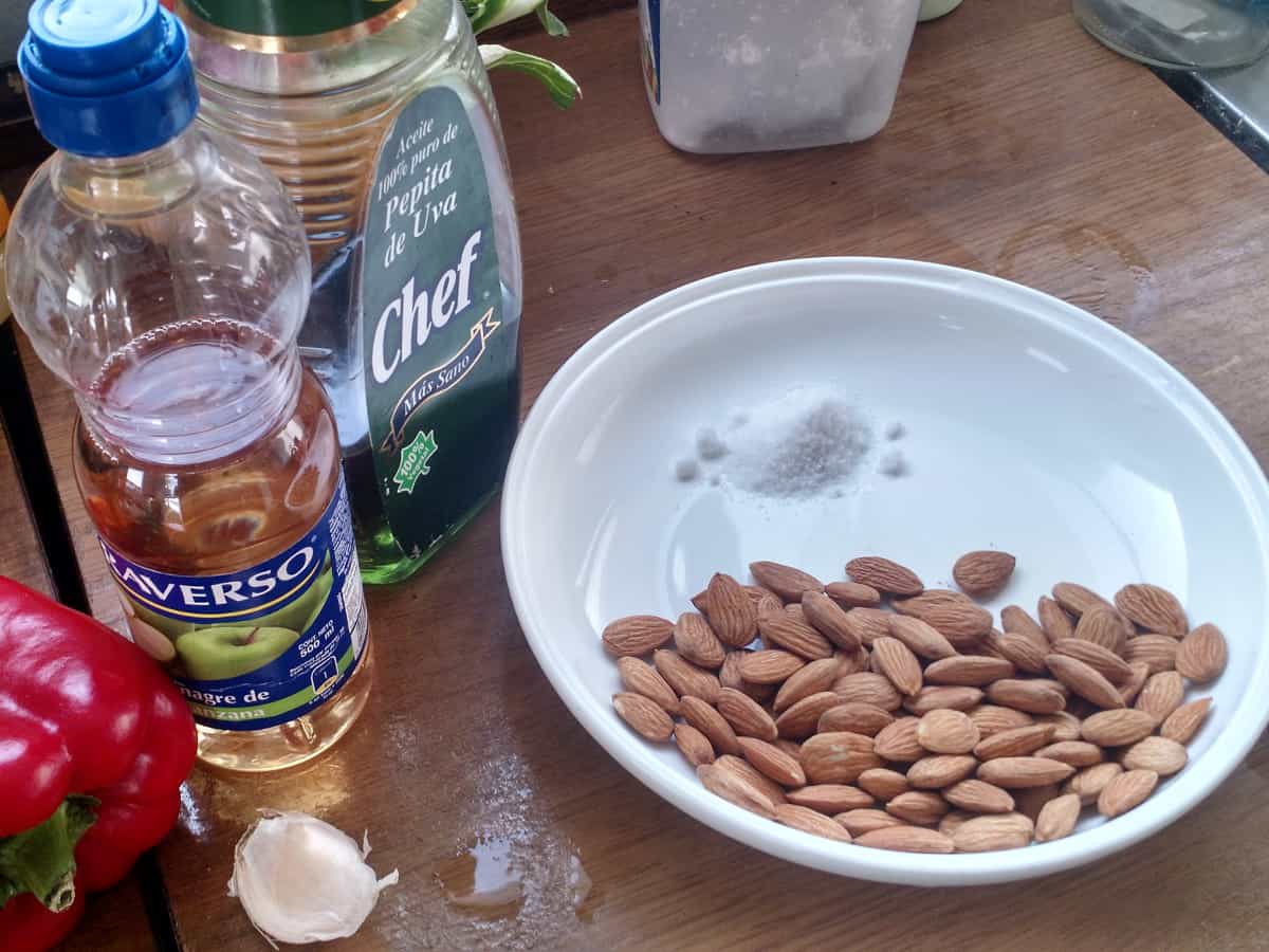 Primero echa las almendras, un trozo de pimentón, condimentos y ajo en la licuadora, agregando un chorro de aceite y otro de vinagre.