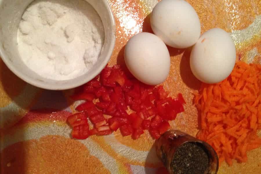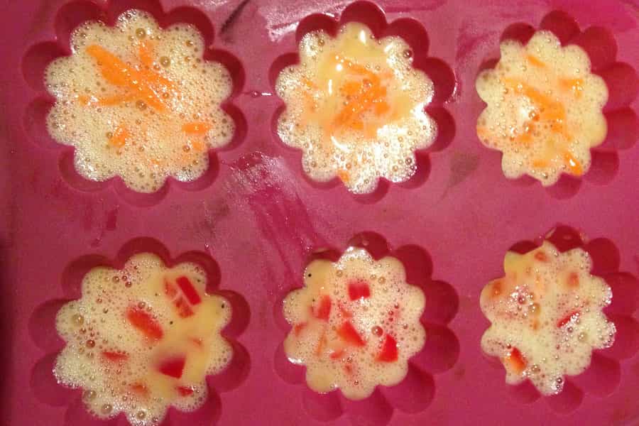 Separas en un lado los huevos con la zanahoria y en otro los huevos con el pimentón.