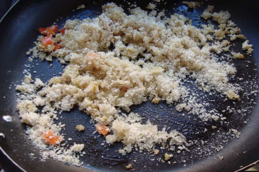En un sartén con mantequilla derretida, saltear la coliflor cruda y el panko o pan rallado. (Puedes agregar pimentón y cebolla picada)