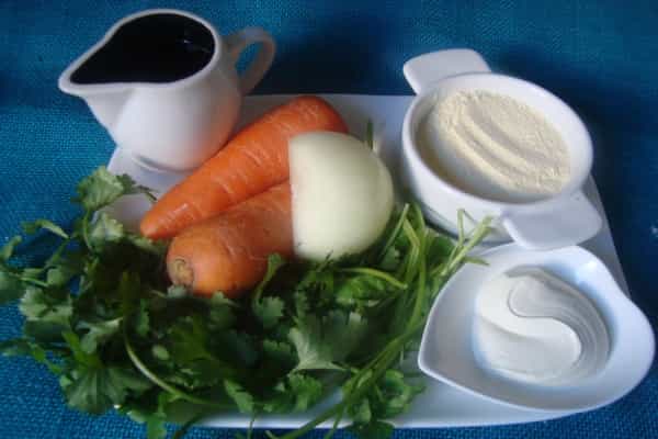 -4 zanahorias, peladas y cortadas en cuadrados -¼ cebolla grande, picada -1 litro de caldo -1 ramo de cilantro -½ taza de crema -200 gramos de harina de maíz -1 cucharada de harina sin polvos de hornear -Aceite de oliva -Sal - Pimienta Preparación Preparar unos nachos, en un recipiente mezclar las harinas, una pizca de sal, y 3 cucharadas de aceite de oliva, agregar agua caliente hasta formar la masa, dejar reposar por 10 minutos.