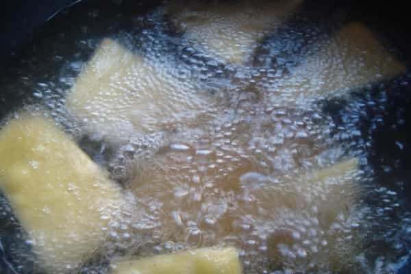 Extender la masa entre dos plásticos, con ayuda de un uslero, retirar el plástico superior con un cuchillo cortar triángulos, poner los triángulos de masa en una bandeja en el congelador por 1 hora. Pasado el tiempo retirar y freír.