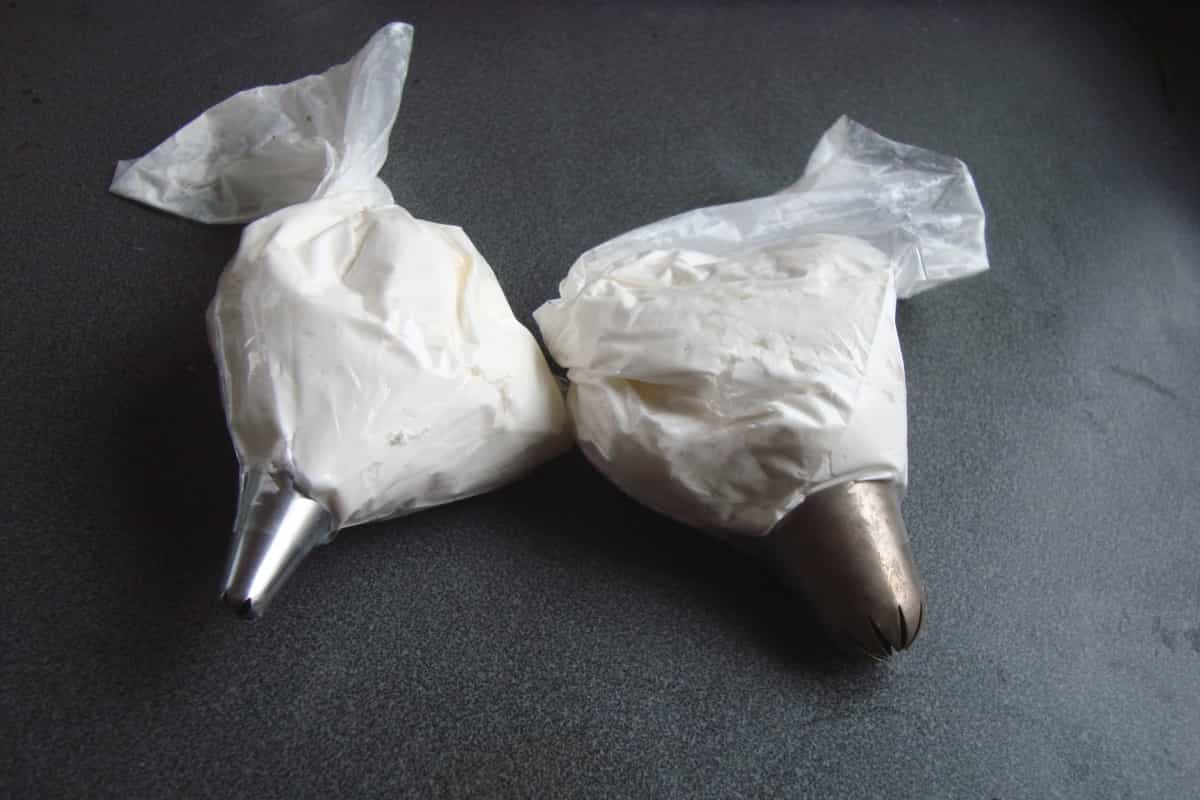 El resto de la crema, dividirla en dos mangas o bolsas plásticas con boquillas distintas, una más grande que la otra.