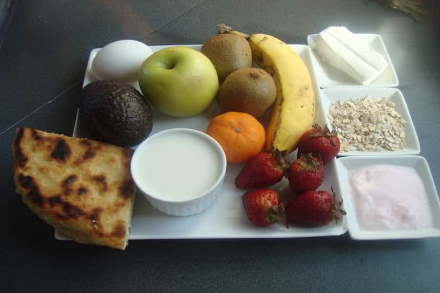 -2 claras de huevo -2 cucharadas de avena -1 cucharadita de vainilla -4 frutillas -½ plátano -2 kiwis -1 yogurt -2 panes -100 gramos de queso de cabra -1 palta -1 cucharada de orégano -400 mililitros (ml) de leche descremada -Endulzante -Sal -Aceite Preparación En un recipiente batir las claras, añadir la avena, vainilla y endulzante a gusto, mezclar hasta incorporar bien.