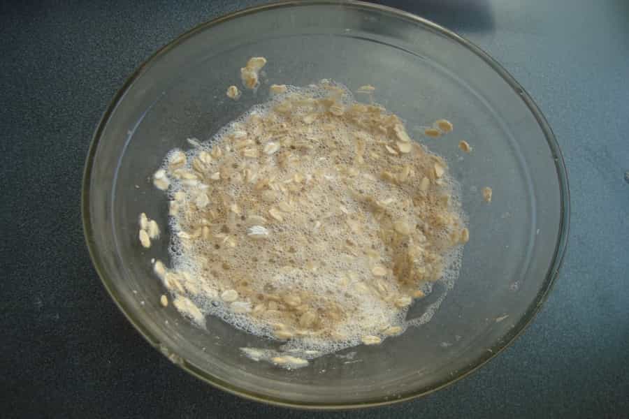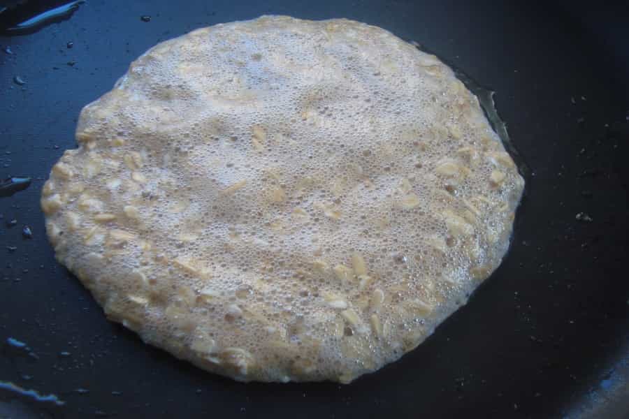 En un sartén con una gota de aceite caliente, verter la preparación de la tortilla, cocinar a fuego bajo, cuando los bordes de la tortilla se tornen dorados darla vuelta y cocinar por 1 a 2 minutos. Colocar la tortilla de avena en un plato.
