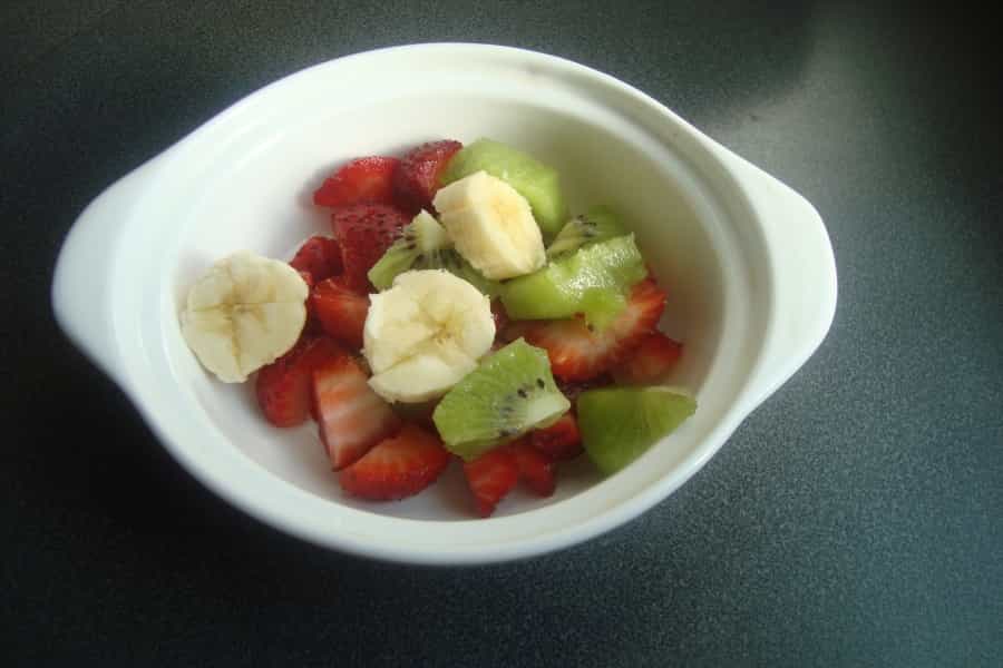 En un recipiente mezclar el yogurt y la fruta (lavada y picada).