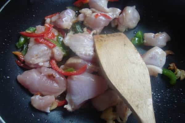 Incorporar el pollo cortado y cocinar por 10 a 15 minutos, hasta que el pollo esté cocido.