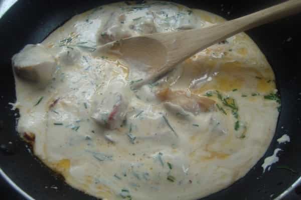 Agregar la crema y el ciboulette lavado y picado, cocinar por 3 minutos, sazonar a gusto.
