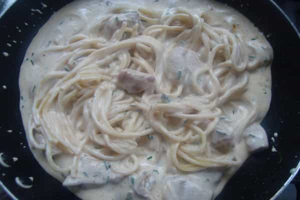 Incorporar la pasta cocina y mezclar, servir y espolvorear con ciboutelle picado.