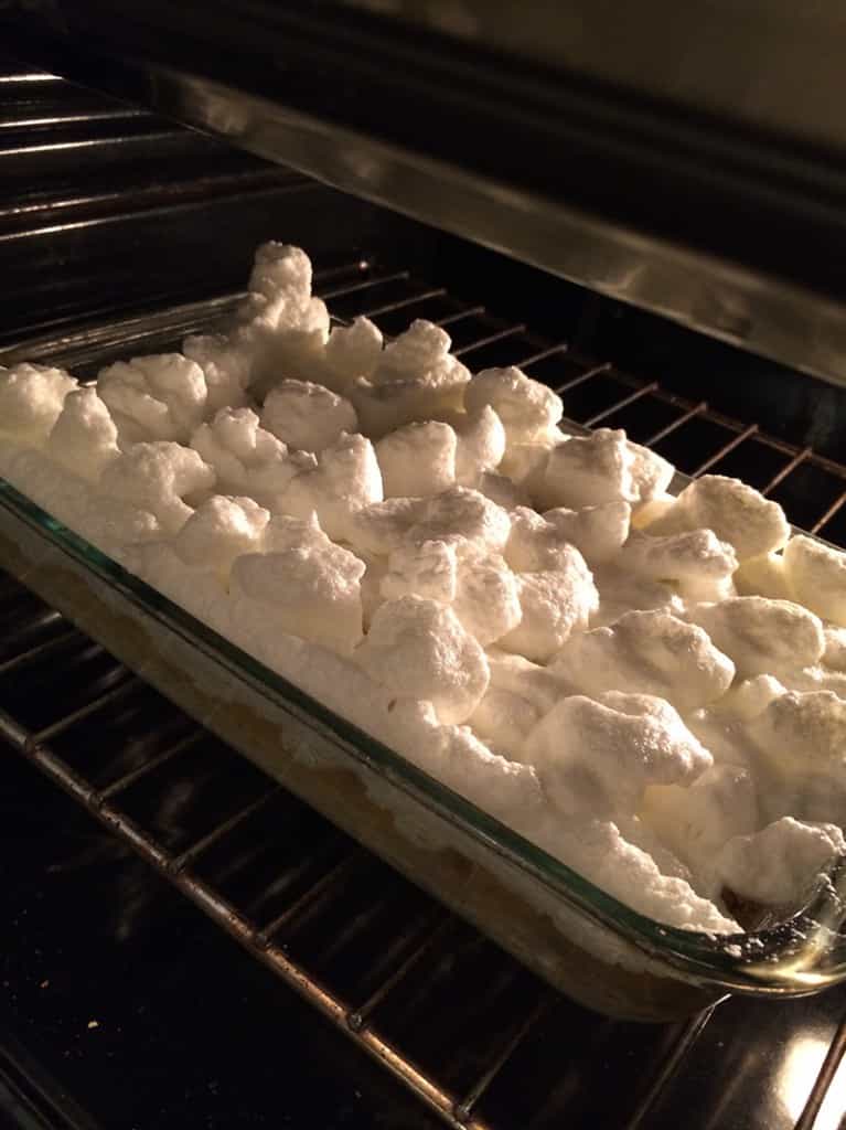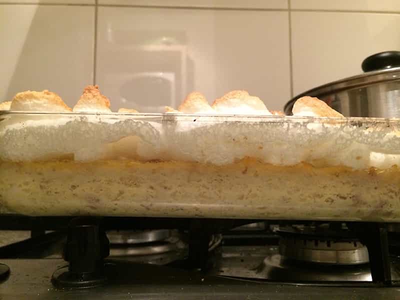 Preparación del merengue: -En una olla mezclar agua con azúcar y calentar a fuego bajo hasta que el azúcar se disuelva. -Una vez que hierva dejar de revolver. -Esperar a que llegue a punto almíbar de pelo. -Para comprobar que ya está en este punto la mezcla se pone mas densa y salen burbujas de color blanco, con una cuchara sacar un poco y con los dedos húmedos tomar entre dos y ver si se forman pequeños hilos. -Revolver las claras hasta que estén espumosas y poco a poco ir agregándole el almíbar de pelo hasta que el merengue este firme. -Sacar la fuente del horno y adornar con ayuda de una manga con merengue. Meterlo nuevamente al horno por unos 5 min hasta que el merengue se dore. Dejar enfriar.