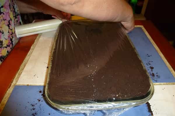 7. Finalmente, cubre el contenido de la budinera con las galletas molidas, envuelve en alusa plast para que no se impregne de olores y sabores y guarda en refrigerador (no congelador) por 3 horas.