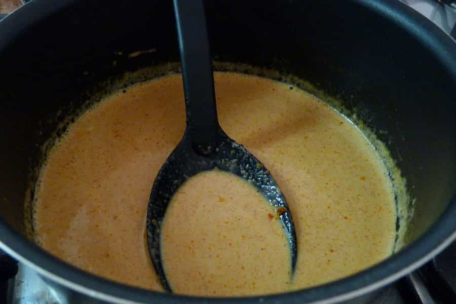 Mezcla la pasta de curry rojo con el aceite vegetal en una olla, calentar durante un minuto. Verter la leche de coco sobre esta mezcla y revolver. Continuar la cocción por 2 minutos más.