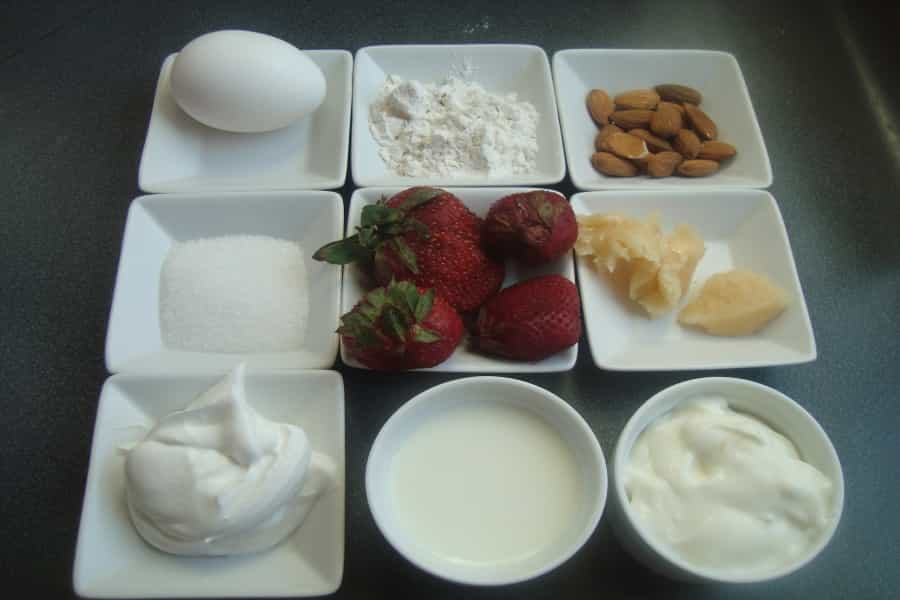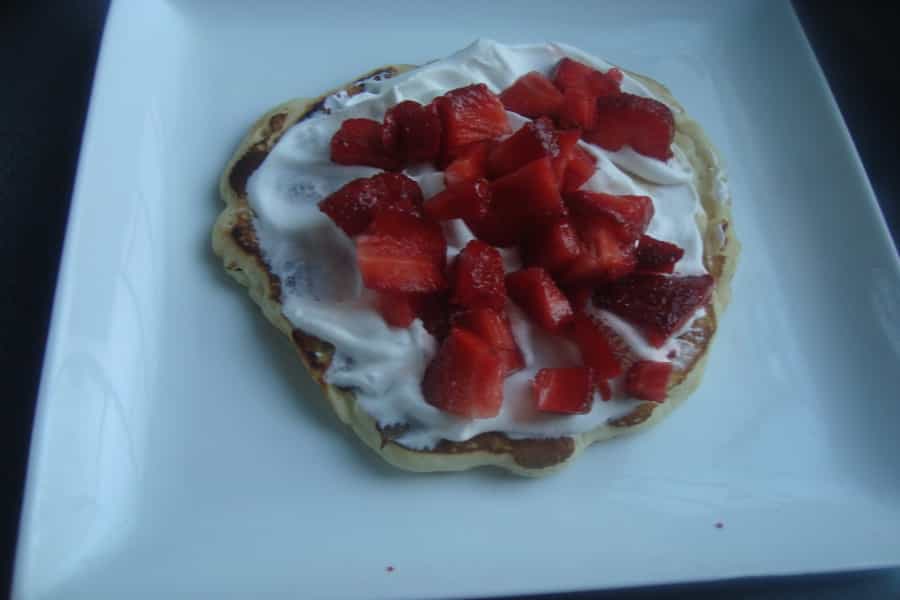 -2 tazas de harina sin polvos de hornear -1 cucharada de polvos de hornear -½ taza de azúcar -1 taza de leche -2 huevos -Mantequilla (cantidad necesaria) -1 taza de frutillas (puede ser cualquier fruta o un surtido de frutas) -1 taza de yogurt (sabor a elección) -3 cucharadas de miel -Crema chantilly (cantidad necesaria) -Almendras para espolvorear Preparación En un recipiente mezclar harina, polvos de hornear, azúcar, leche y huevos, batir bien hasta formar una masa homogénea.