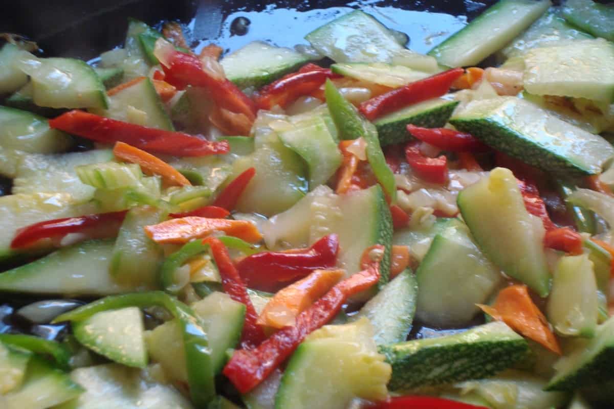 En un sartén con 3 cucharadas de aceite de oliva caliente, saltear por 3 minutos las verduras cortadas en tiras. Sazonar con sal, merquén y orégano a gusto.