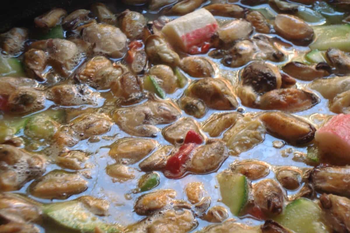 Incorporar los mariscos y el vino blanco, cocinando destapado a fuego medio por 15 minutos.