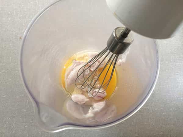 Bate los huevos con el yogurt hasta que se forme una crema espumosa, luego agrega todos los ingredientes menos las frutas.