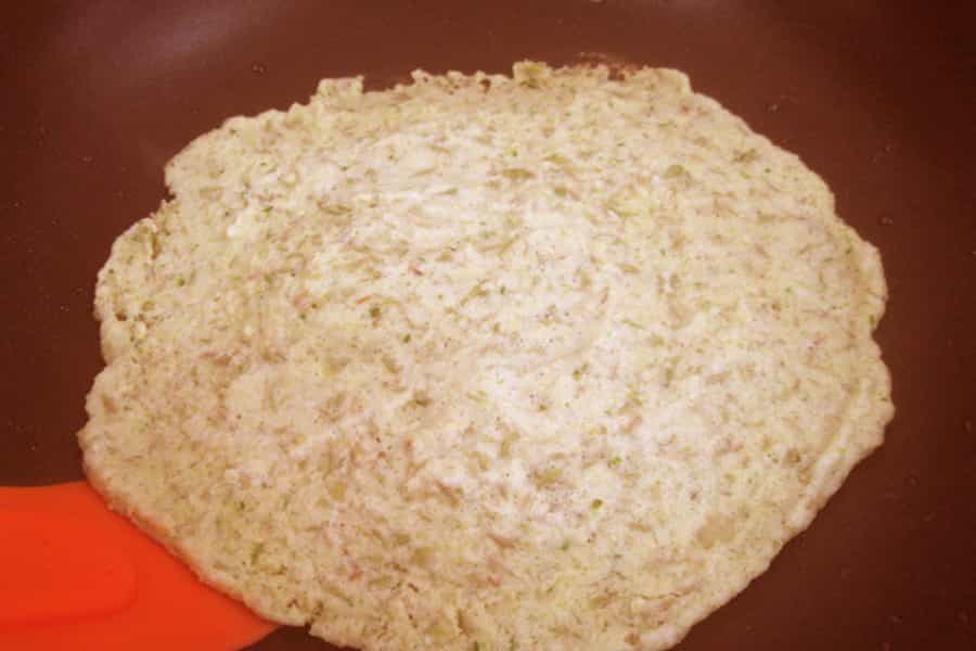 Espera a que la superficie de la "tortilla" se seque por completo antes de darla vuelta. Voltea la tortilla ayudándote con una espátula y retírala del fuego cuando comience a dorarse por el otro lado. Verás que la masa queda un poco húmeda por dentro y así debe ser, ya que terminará de cocinarse en el horno. Ve preparando las tortillas hasta que acabes con la mezcla (con estas cantidades, deberías obtener 3 a 4 tortillas).
