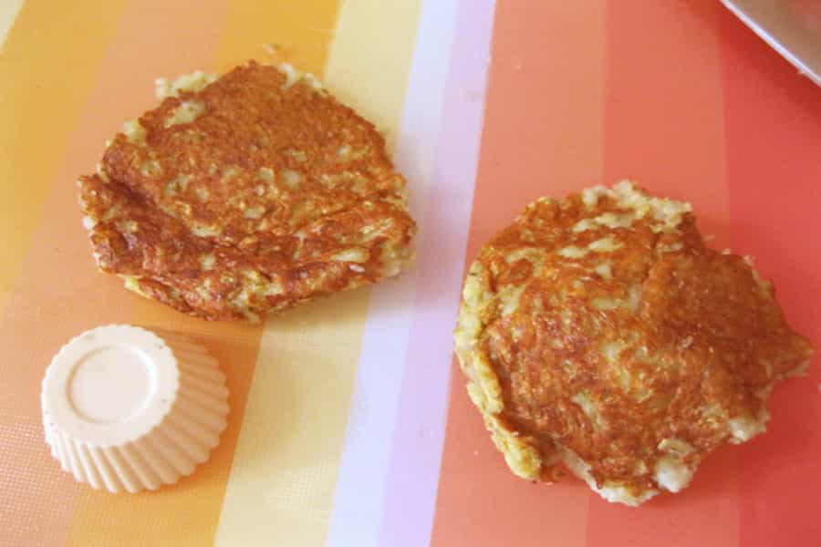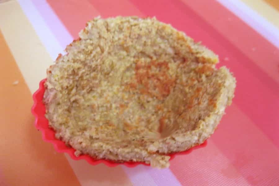 Lo siguiente es cortar la masa de lentejas de acuerdo al tamaño de los moldes que vayas a utilizar. Acá utilizamos moldes de silicona para muffins de dos tamaños distintos, aunque también puedes usar una bandeja anti adherente para muffins o recipientes de cerámica aptos para horno. Precalienta el horno por 5 minutos mientras das forma a las tulipas. Para esto hay dos métodos: puedes voltear el molde de muffin y colocar el círculo de masa por encima, colocando la tulipa en esta posición sobre la bandeja de horno. El otro método es colocar la masa dentro del molde o recipiente y hornearla de esta manera, aunque con este método es más fácil que la masa se rompa si el molde es muy pequeño.