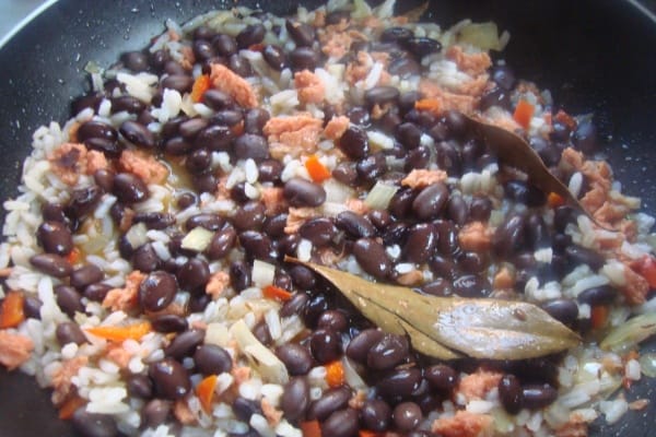 Transcurrido el tiempo, revisar que el arroz esté cocido, de no ser así, agregar un poquito de líquido, revolver y cocinar por 5 minutos. Una vez que el arroz esté listo, añadir los porotos negros, mezclar suavemente, cocinar por 5 minutos. Apagar, dejar reposar unos 5 minutos antes de servir.