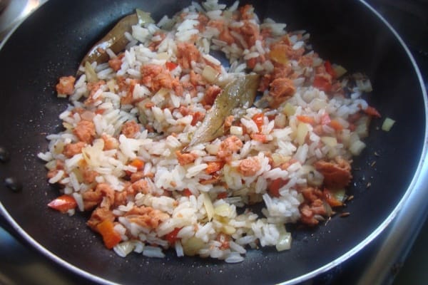 Añadir el arroz, revolver y sofreír por 5 minutos, agregar 3 tazas de liquido (puede ser agua caliente o el caldo de la cocción de los porotos), cocinar tapado a fuego bajo por 20 minutos.