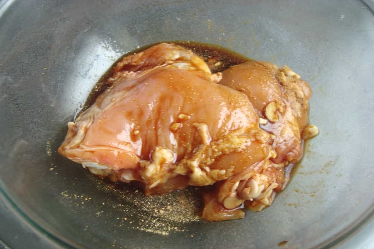 Sazonar las presas de pollo con 1 ajo picado, la mitad del jengibre y la mitad de la soya. Dejar marinar en el refrigerador por 30 minutos.