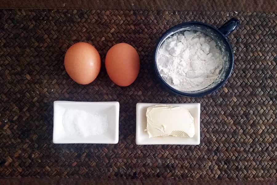 Lo primero que haremos será la masa. Para esto, mezcla los 2 huevos con la margarina (a temperatura ambiente). Una vez revueltos, agrega poco a poco la harina y la sal sin dejar de revolver.