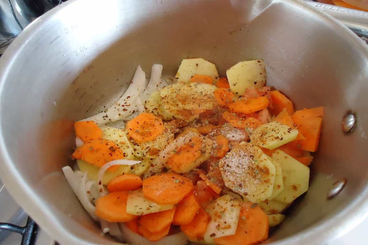 Agrega las zanahorias peladas y cortadas en rodajas, los tomates pelados y picados en cubos, además de las papas peladas y en trozos. Sazona con sal, pimienta, ají de color, orégano y una pizca de merquén. Cocina por 2 a 3 minutos.