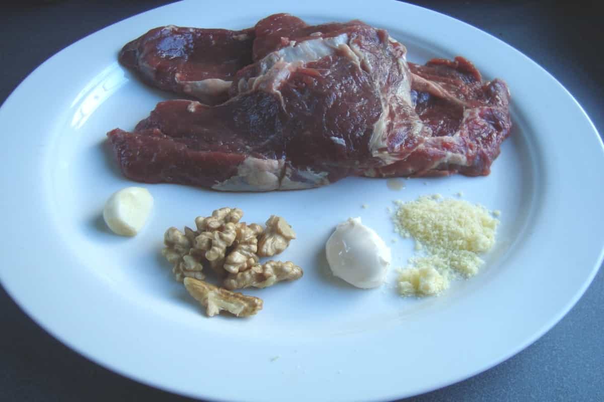 En un sartén con aceite caliente, sellar los trozos de lomo salpimentados (deben quedar dorados por fuera, pero crudos por dentro). Cubrir cada trozo de lomo con la pasta de nueces y queso, cocinando por 2 minutos.
