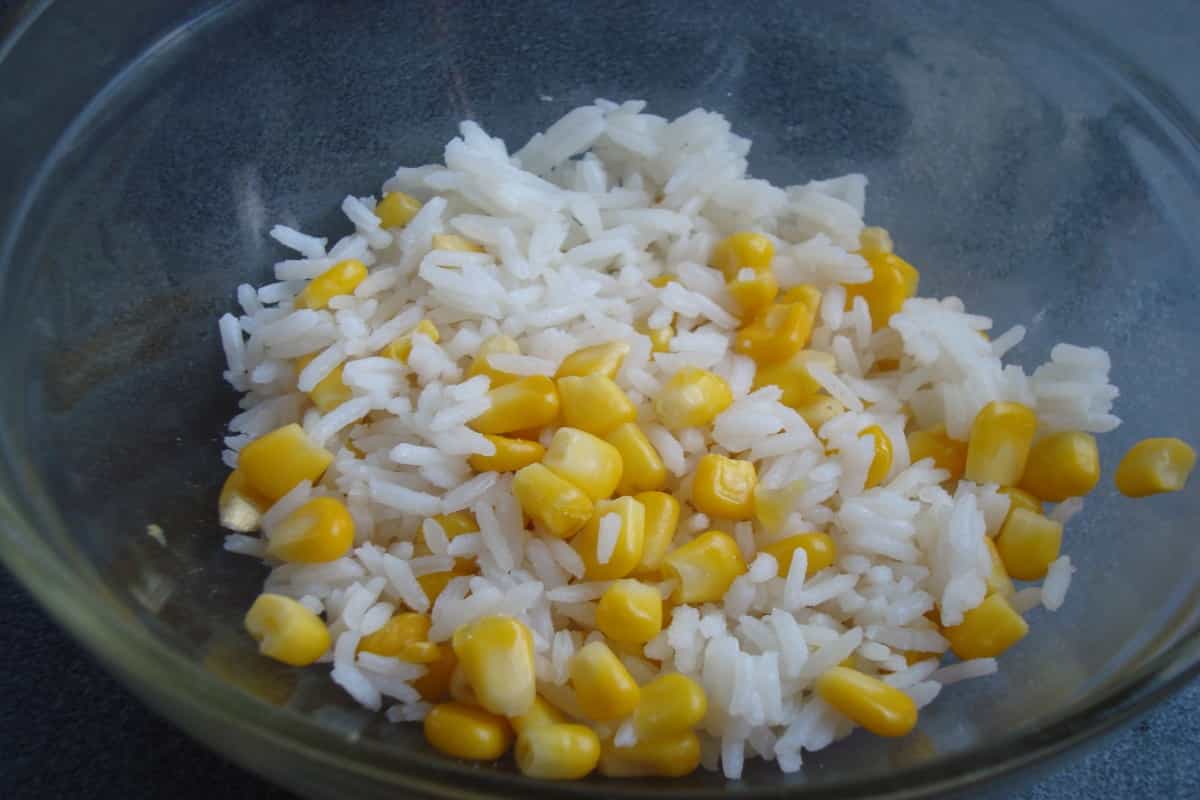 En un recipiente, mezclar choclo en grano cocido y arroz, también cocido.