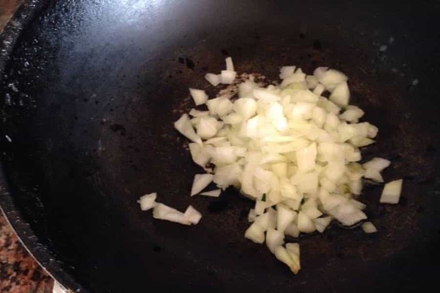 Luego pica la cebolla en cuadros pequeños. Agrega un poco de aceite en el sartén y ponla a freír.