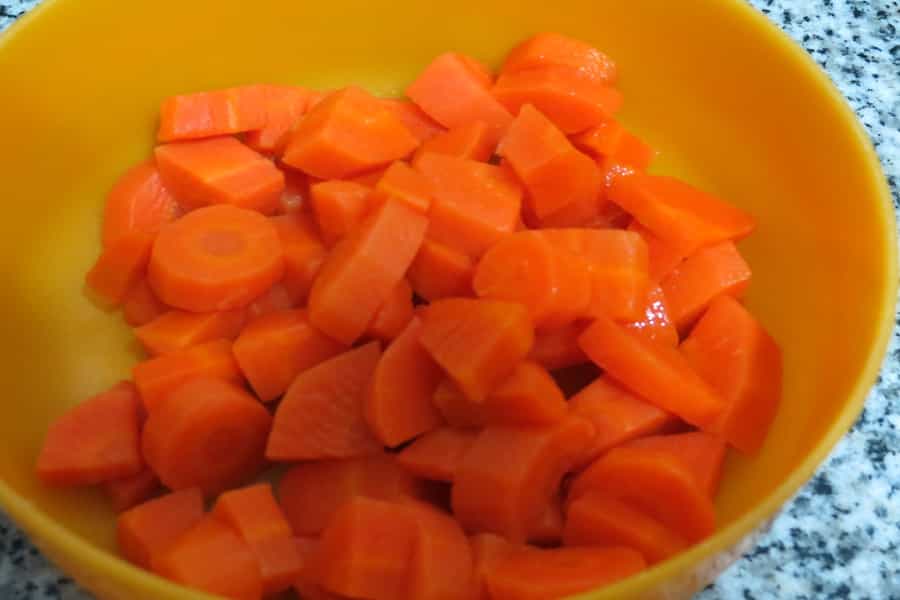 Cortar las zanahorias en cubos medianos y colocarlas en agua hirviendo con un una pizca de sal, esperar 10 minutos para que se cocinen