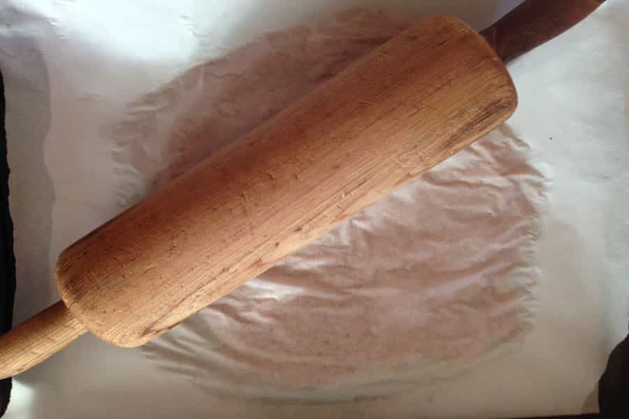 Luego cortaremos dos pedazos de papel mantequilla del porte de la bandeja del horno. Pones la masa sobre un papel y la cubres con el otro papel. Con uslero comienzas a expandir la masa. Debes tener cuidado de que no quede muy delgada. Con estos ingredientes dos personas podrían comer tranquilamente.