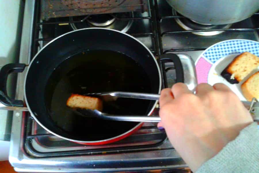 2. En una olla agrega el vaso de agua, el ron y una taza de azúcar. Lo importante es que debes dejarlo hervir y que repose 5 minutos. Esta sencilla mezcla la utilizaremos para remojar nuestros bizcochos ahí. Ten mucho cuidado de no quemarte, así es que ayúdate con una espátula para que sumerjas el queque y lo puedas sacar fácilmente.