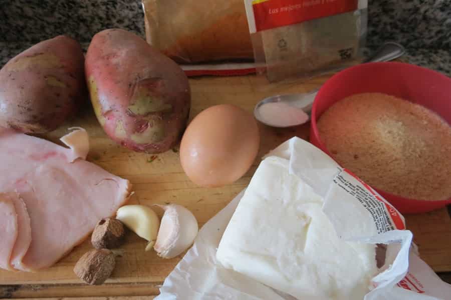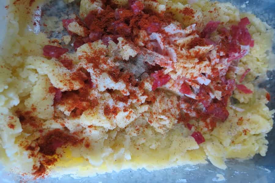 Colocar las papas peladas en agua hirviendo hasta que estén cocidas (partidas por la mitad de cuecen más rápido). Aplastarlas con la manteca o mantequilla mientras están calientes hasta formar un puré, dejar reposar (debe estar tibio para poder manipular) y después agregar: ajo, sal y pimienta, pimentón en polvo, jamón y salame cortados y nuez moscada. Revolver hasta mezclar todos los ingredientes.