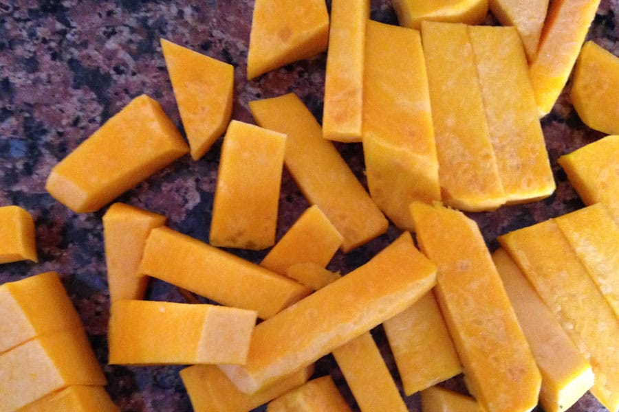 Corta el zapallo en cuadros y lo pones a coser hasta que se ablande en dos tazas y media de agua.