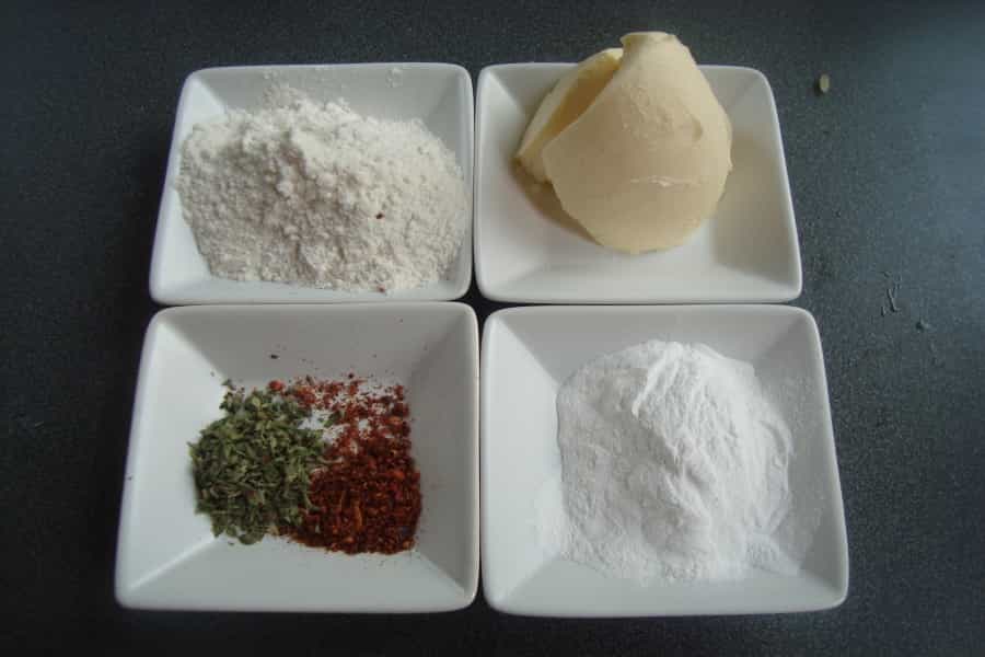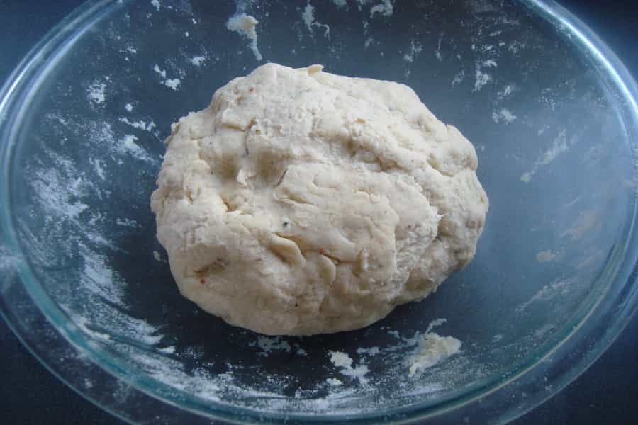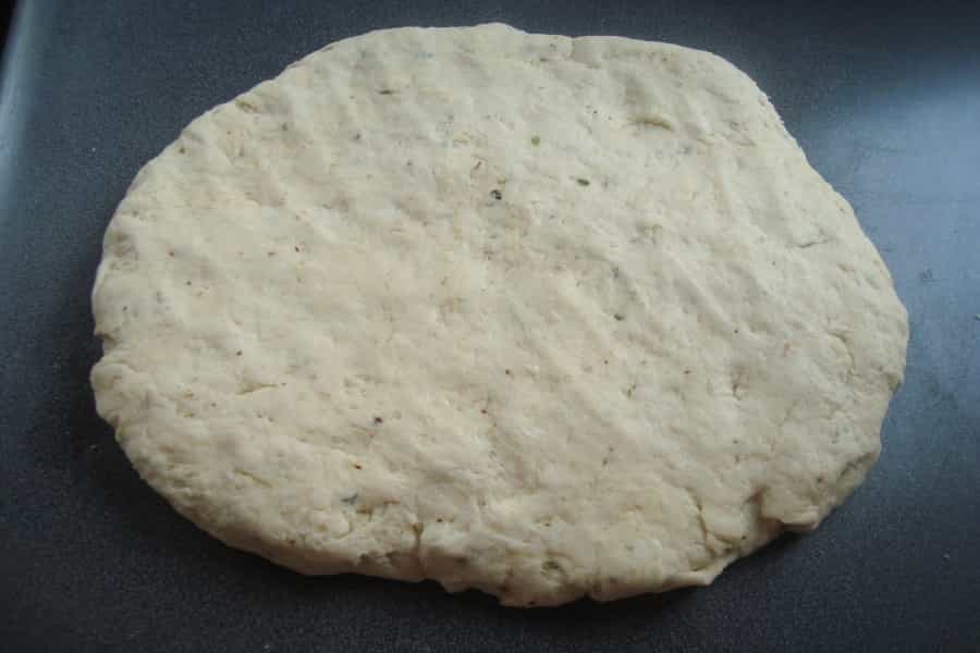 En un recipiente cernir la harina, bicarbonato y la sal, revolver hasta mezclar bien, incorporar el orégano y el merquen, mezclar. En el centro añadir la manteca o margarina previamente derretida (tibia), posteriormente agregar agua tibia en pequeñas cantidades y amasar hasta tener una mezcla homogénea y consistente.