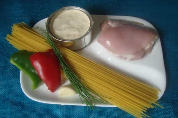 -1 paquete de espagueti (400 gramos -½ kilo de filetes de pollo -400 centímetros cúbicos (cc) de crema -2 dientes de ajo -½ morrón rojo -½ morrón verde -Ciboulette -Aceite de oliva -Sal - Pimienta Preparación Cocinar los espagueti según las instrucciones del envase, logrando una cocción al dente, escurrir, agregarles aceite de oliva y reservar. Cortar el pollo en trozos pequeños, reservar. En un sartén con aceite de oliva, sofreír por 5 minutos a fuego medio, los morrones cortados en tiras y los dientes de ajo picados finamente.