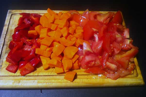 Corta el zapallo, las zanahorias, los tomates y el pimentón en cubos irregulares.