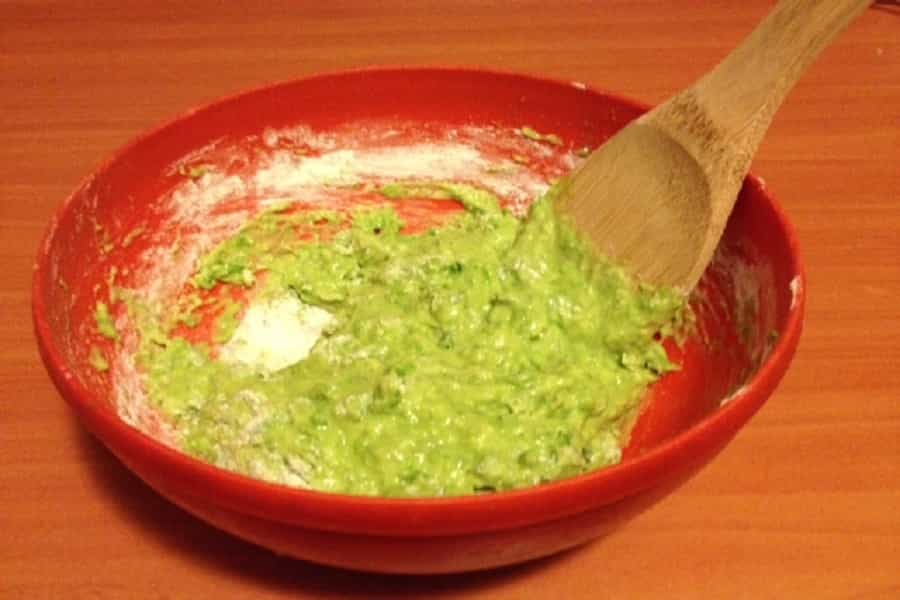 2.- Después de cocinar las arvejas, las haces puré. En mi caso, utilicé una minipimer para que quedaran bien. Después de eso, se mezclan las arvejas con el huevo, la harina, la sal, condimentos, etc.