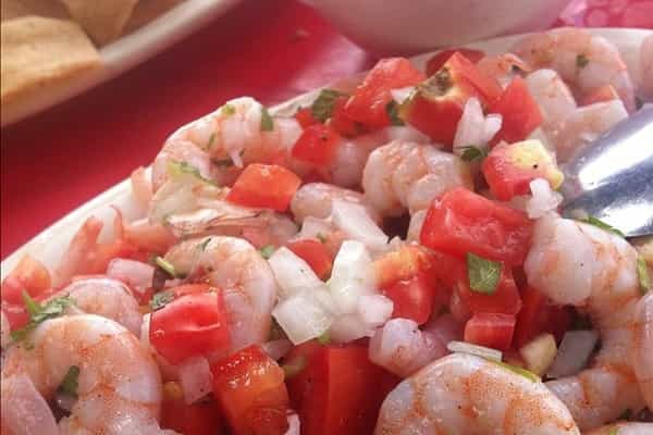 Ingredientes: -250 grs. de camarones. -3 tomates rojos medianos. -1/2 cebolla. - 1 mata pequeña de cilantro. -Sal. -Pimienta o merquén. -Jugo de 4 limones grandes. Preparación: 1.Lava y pela los camarones (en caso que vengan con cáscara). En una olla pequeña, déjalos hervir por 2 minutos. Retíralos y consérvalos en un bol hasta que estén fríos. 2. Lava y pica en cubos pequeños la cebolla y los tomates. También lava el cilantro y trózalo con la mano. 3. Junta los trozos de tomates y cebolla con los camarones y aliña con sal, pimienta, o merquén, y abundante limón. 4.Sirve inmediatamente. Bacalao chillanejo: