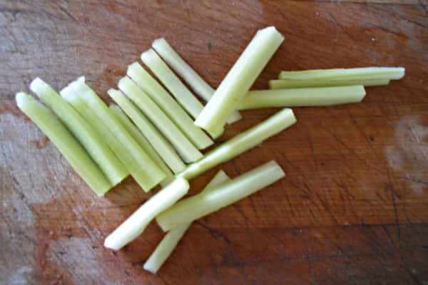 Preparación: Lava y corta en filetes los pejerreyes, te aconsejo que lo hagas con un cuchillo con mucho filo, así se te hará más fácil la tarea; después corta tiras delgadas de 10 cm aproximadamente, para terminar con esto, deja reposando los trozos en una fuente con el jugo de limón. Por otra parte, lave el apio, pélalo y córtalo en bastoncitos delgados.