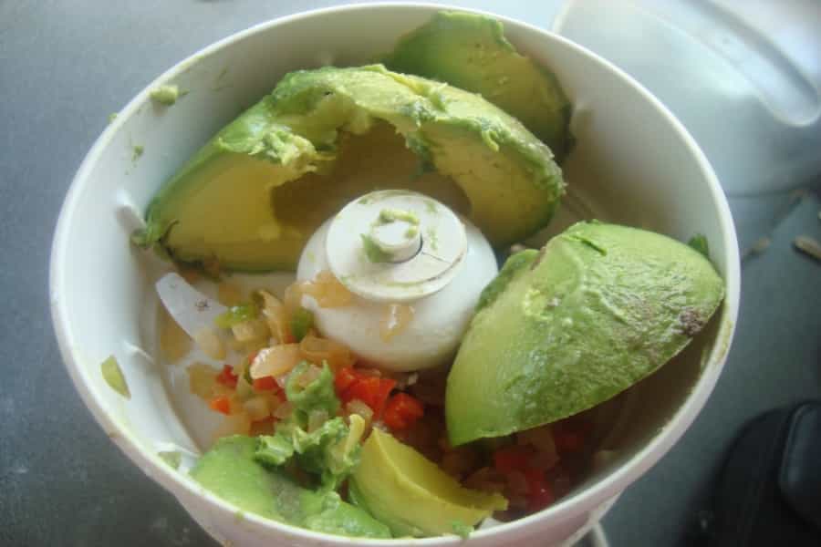 Pelar las paltas y eliminar el carozo, rociarlas con el jugo de ½ limón. En una juguera o procesadora colocar el sofrito de cebolla y pimentón y la palta, triturar.