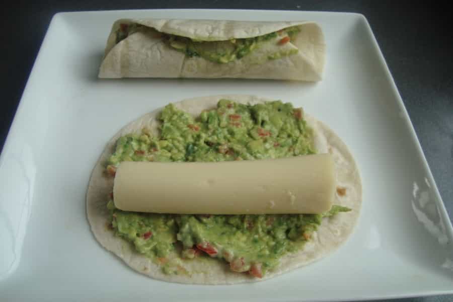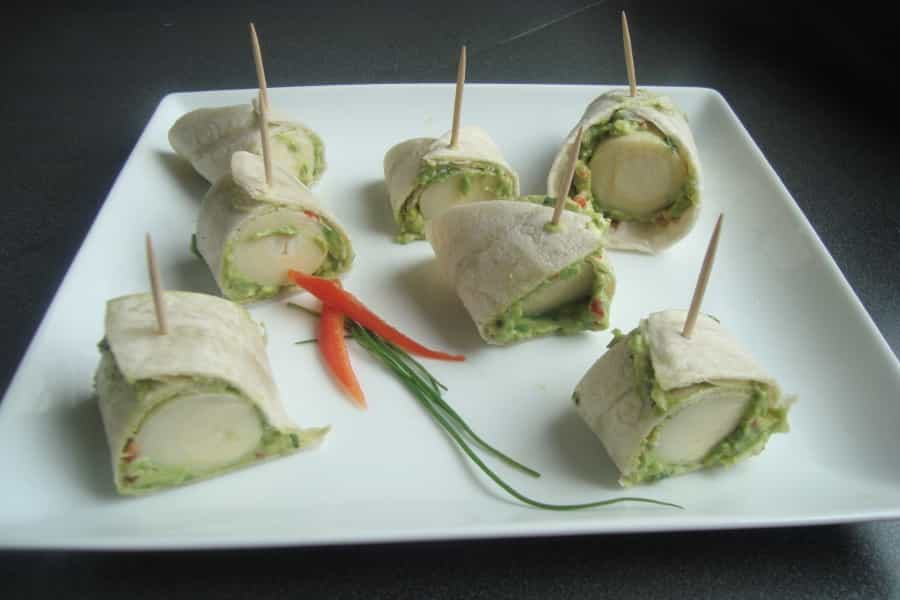 Untar las tortillas con la salsa de palta, disponer en una orilla un palmito y enrollar.