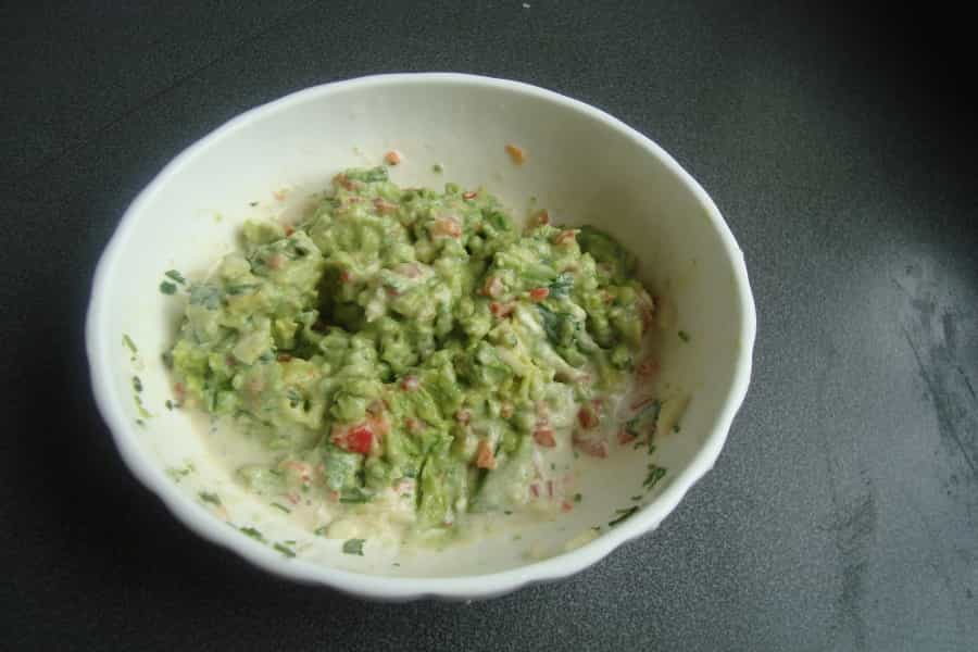 En un pocillo colocar las paltas peladas y sin carozo, con un tenedor molerlas. Incorporar el pimentón y el ajo picado finamente, añadir el cilantro picado y el jugo de limón. Sazonar a gusto.