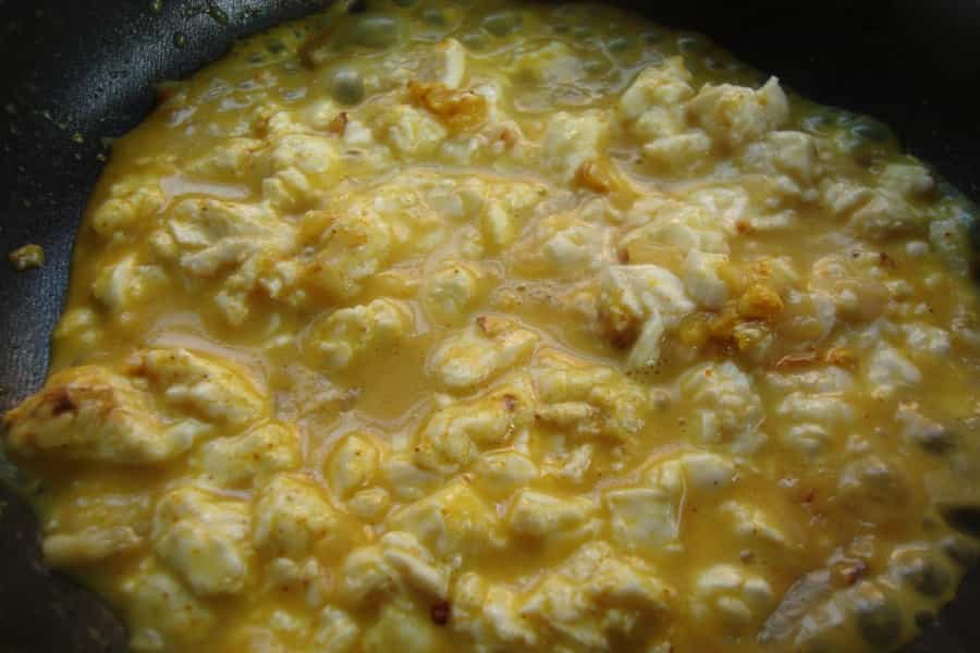 Incorporar el tofu desmenuzado, sazonar a gusto y revolver suavemente hasta incorporar, cocinar por 5 minutos a fuego bajo (si la preparación se seca, puedes añadir un poco de liquido). Apagar y servir.
