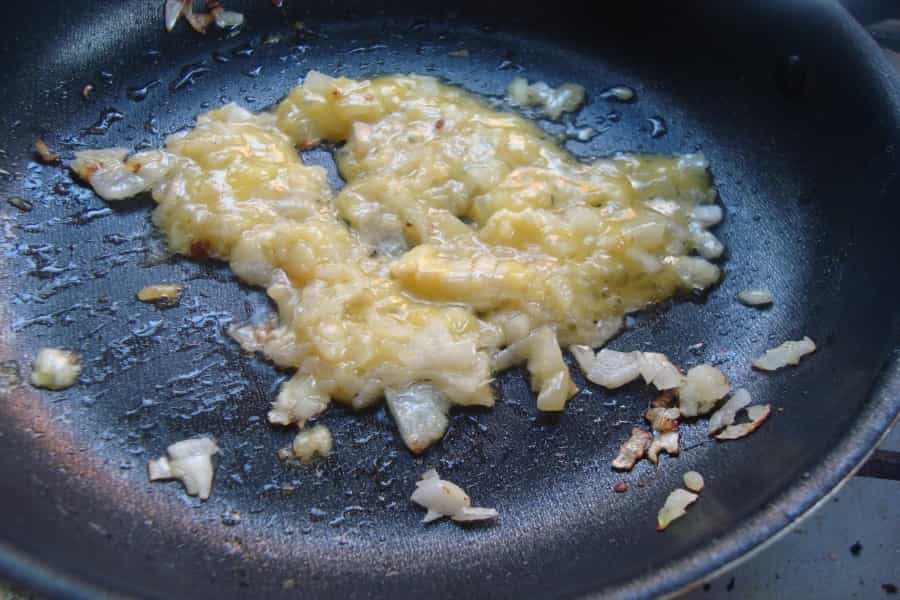 En un sartén con 1 cucharada de aceite caliente, saltear por 2 minutos la cebolla picada en cubos pequeños y el diente de ajo machacado. Añadir la mostaza.