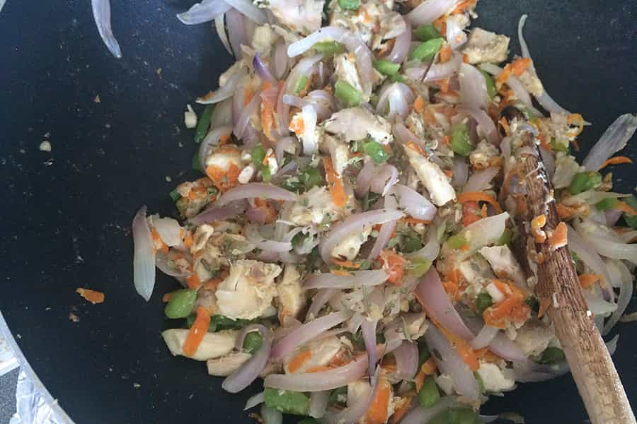 Se pone en un wok la cebolla con el ajo primero y comenzamos a sofreírlos. Le ponemos sal para que se vuelva más tierna y añadimos luego las demás verduras, que en este caso son la zanahoria y el pimentón. Es importante que la cebolla vaya primero porque se demora un poco más. También añadimos orégano o albahaca para que quede más sabroso. Cuando veamos que nuestras verduras ya están tiernas añadimos el pollo.