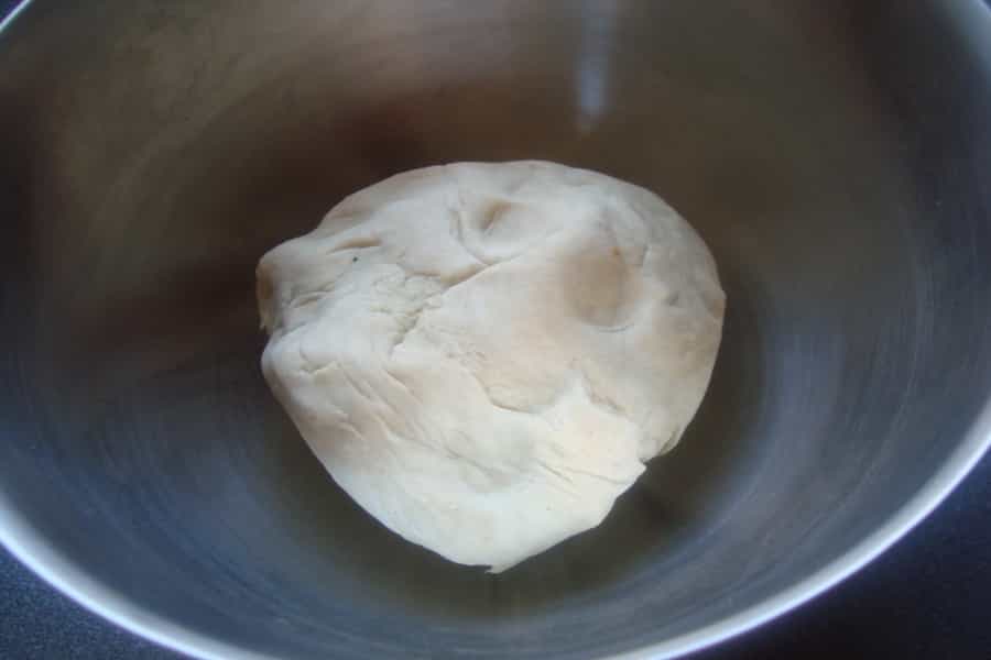 En un recipiente mezclar harina, dos huevos y la margarina derretida, añadir la salmuera de a poco y mezclar bien y amasar hasta formar una masa lisa y homogénea.