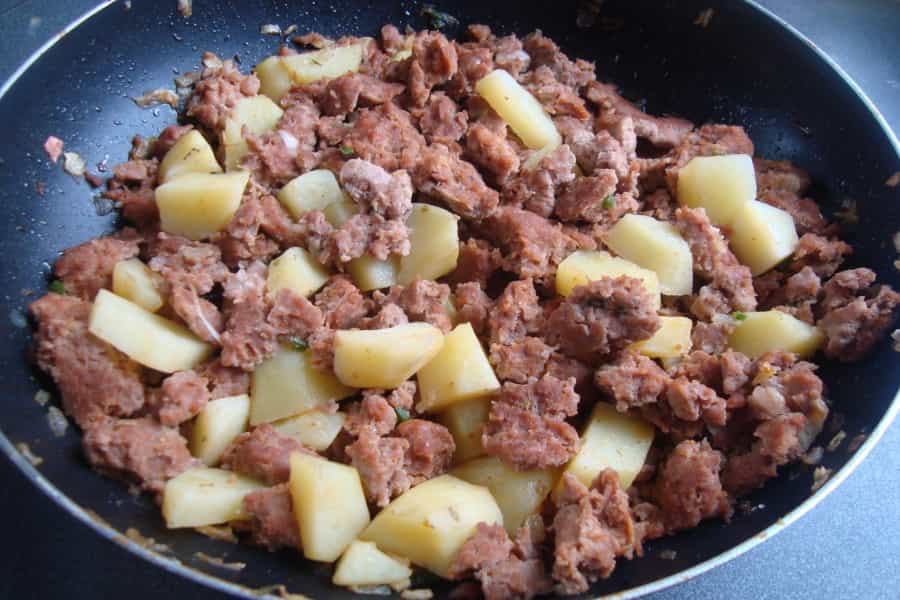 Cuando la carne este lista, retirar del fuego y añadir las papas cocidas, revolver y rectificar la sazón del relleno.